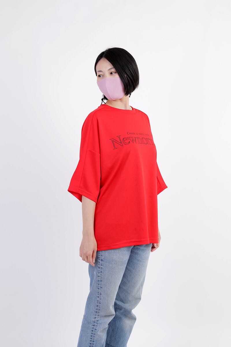 ブランドテーマ「Create a story with Newnormal」を配置した一枚。シンプルかつ動きが出るよう採用されたブレたフォントが特徴的。ビッグシルエットの5部袖で、